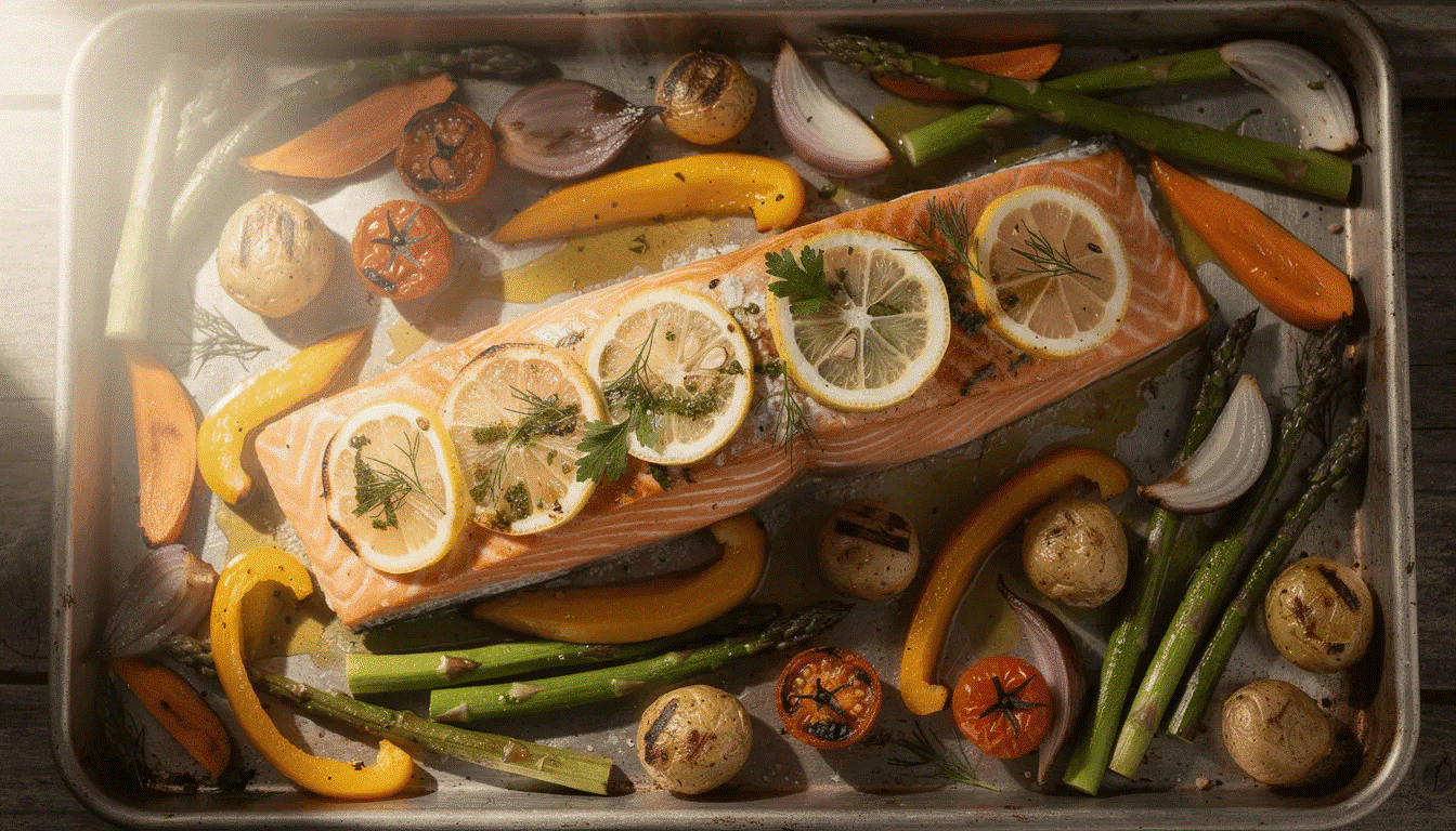 - Filet de saumon au four avec citron et herbes — Le saumon est riche en oméga-3 essentiels. Accompagnez de brocolis vapeur et de pommes de terre grenaille rôties. 25 minutes au four, dont 20 sans intervention de votre part.