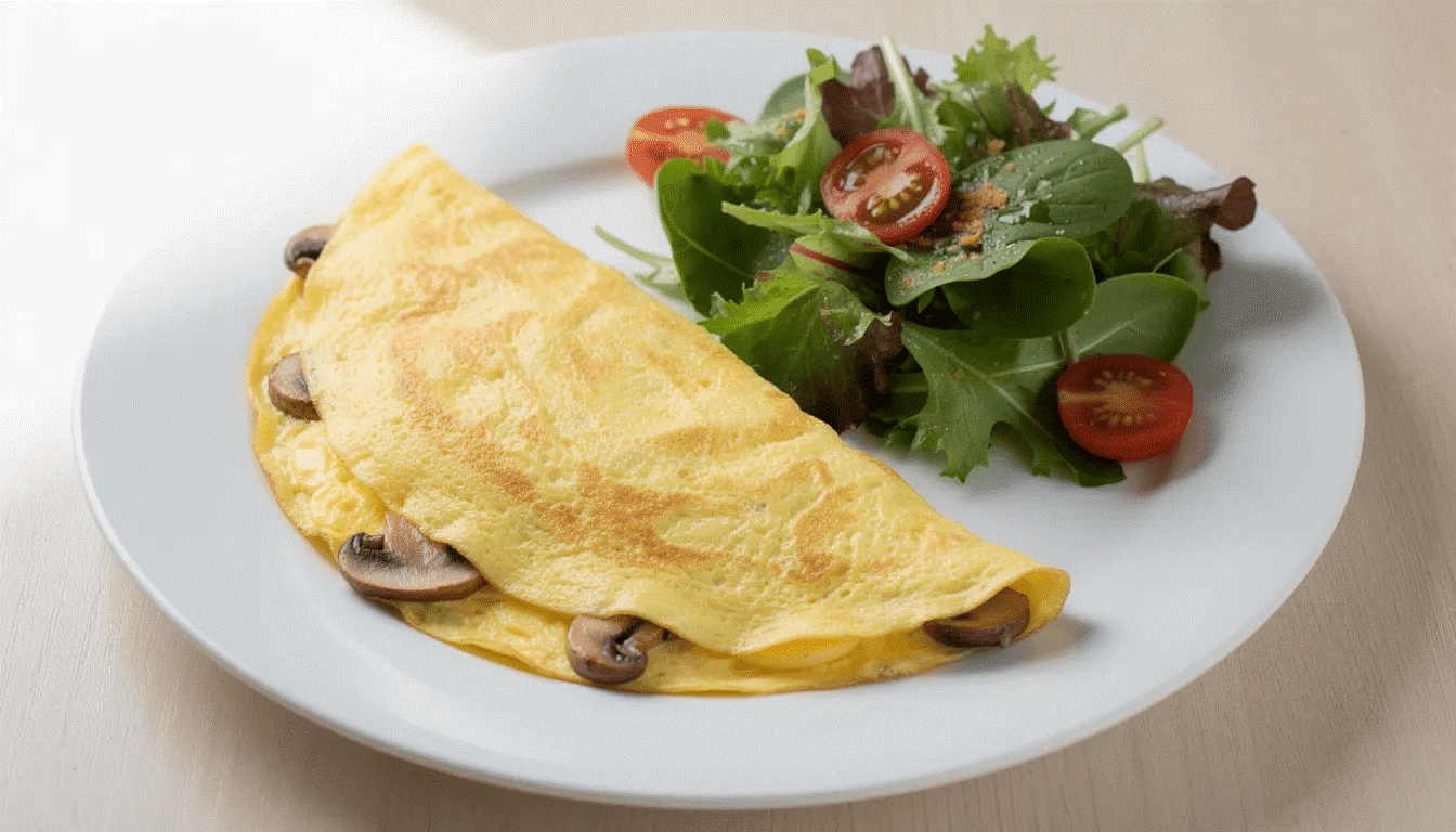 - Omelette aux champignons et salade verte — Les protéines des œufs, des légumes, et un fruit en dessert. Utilisez des champignons frais ou surgelés selon ce que vous avez. Moins de 10 minutes de préparation, et les fourneaux restent propres.